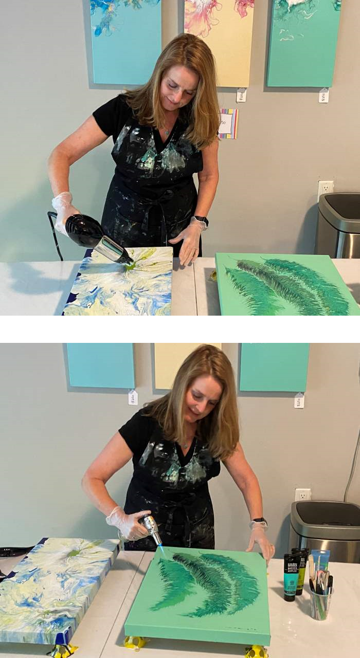 This technique allows all of the colors to swim together, without mixing. The puddle pour consists of laying puddles of color onto your canvas. Then tilt or blow the canvas to meld the colors into one another and create patterns.
